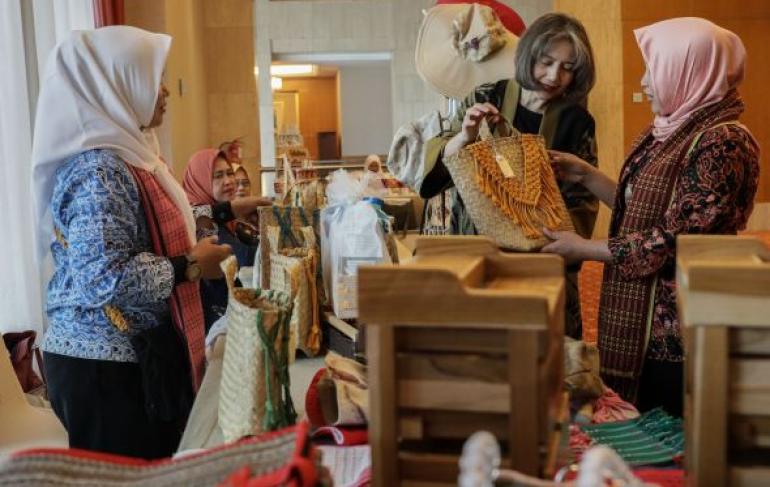Co-Founder dan Chief Operating Officer DOKU, Nabilah Alsagoff (tengah) didampingi Ketua Umum Perkumpulan Wirausaha Pekerja Migran Indonesia, Sulistyaningsih (kanan) melihat produk UMKM yang dipamerkan pada acara Strategic Partnership for Digital Future di Jakarta, Kamis (31/8/2023). Sebagai salah satu mitra dalam program Mastercard Strive Indonesia, DOKU berperan dalam menyediakan akses bagi UMKM untuk go digital melalui ragam metode pembayaran yang dapat diakses dengan mudah dengan layanan Juragan DOKU