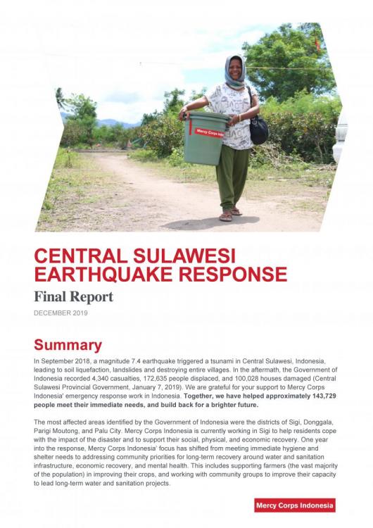 Gempa bumi berkekuatan 7.4 SR melanda Sulawesi Tengah pada 28 September 2018, memicu tsunami, likuifaksi, dan tanah longsor. Peristiwa ini menyebabkan setidaknya 4,340 orang meninggal dunia dan 100,028 rumah rusak (Pemerintah Provinsi Sulawesi Tengah, 7 Januari 2019). Bahkan, lebih dari 133,000 orang masih mengungsi (UNOCHA, 14 Januari 2019). Daerah paling terdampak yang diidentifikasi oleh Pemerintah Indonesia adalah Sigi, Donggala, Kota Palu dan Parigi Moutong. Besaran kerugian ekonomi akibat bencana diperkirakan mencapai 40 Triliun Rupiah (sekitar USD 2.8 Miliar) dan pemulihannya diperkirakan mencapai minimal tiga tahun. Mercy Corps Indonesia (MCI) telah bekerja memenuhi kebutuhan mendesak para penyintas dari serangkaian bencana tak terduga di Palu, Sigi, dan Donggala serta kini mulai memposisikan dirinya untuk beralih ke upaya untuk mendukung pemulihan ekonomi jangka panjang dan membangun ketahan, dengan penekanan untuk memulai sektor pertanian dan memastikan para petani memilki sumber yang dibutuhkan untuk maju.